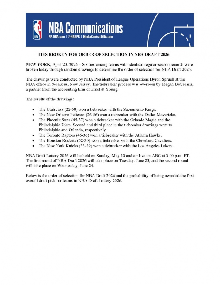 直播吧4月21日讯 今日NBA官方宣布,联盟通过随机抽签确定了本赛季6组常规赛战绩相同球队的选秀顺位。